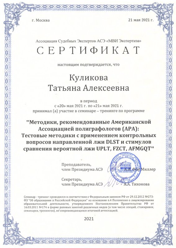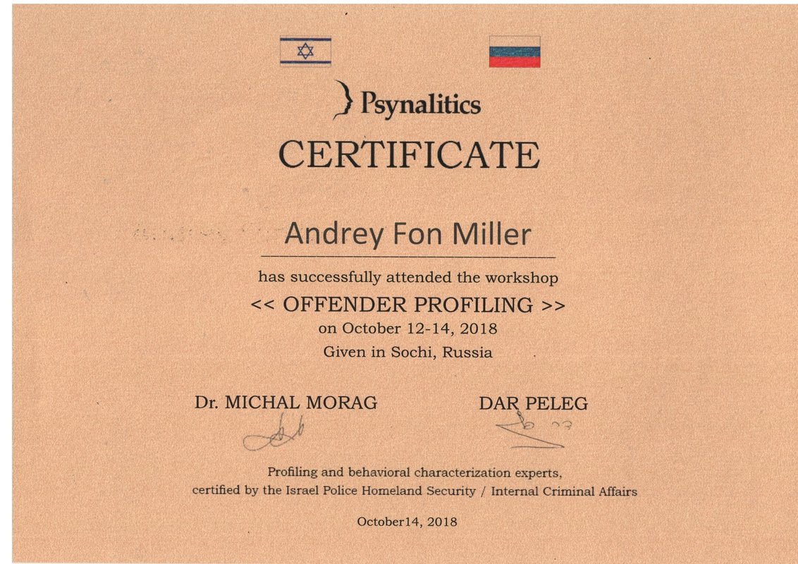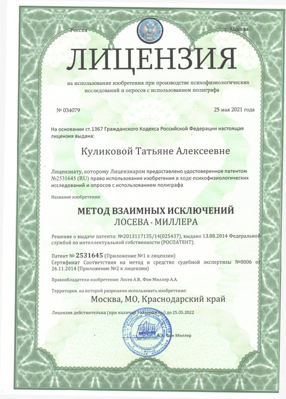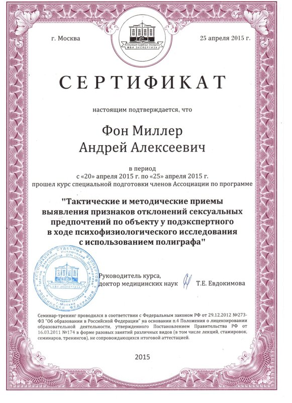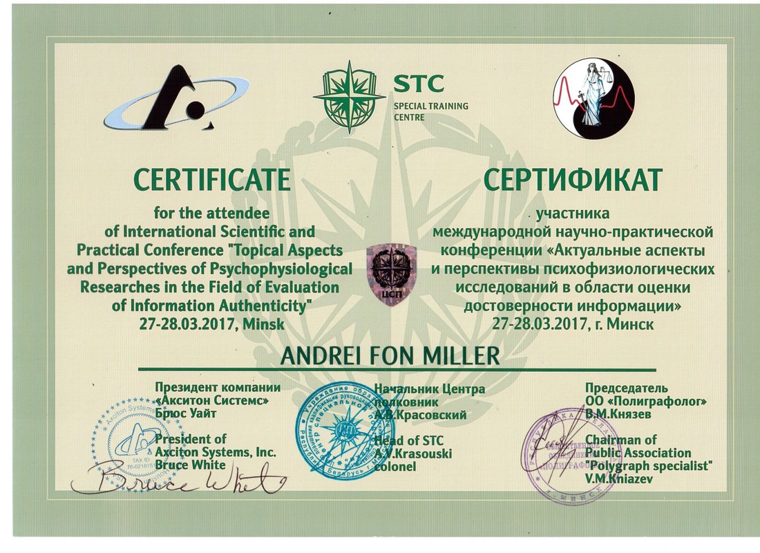 а также огромное количество повышений квалификаций и курсов, в том числе лицензия на использование Метода взаимных исключений Лосева – Миллера при производстве психофизиологических исследований и опросов с использованием полиграфа.