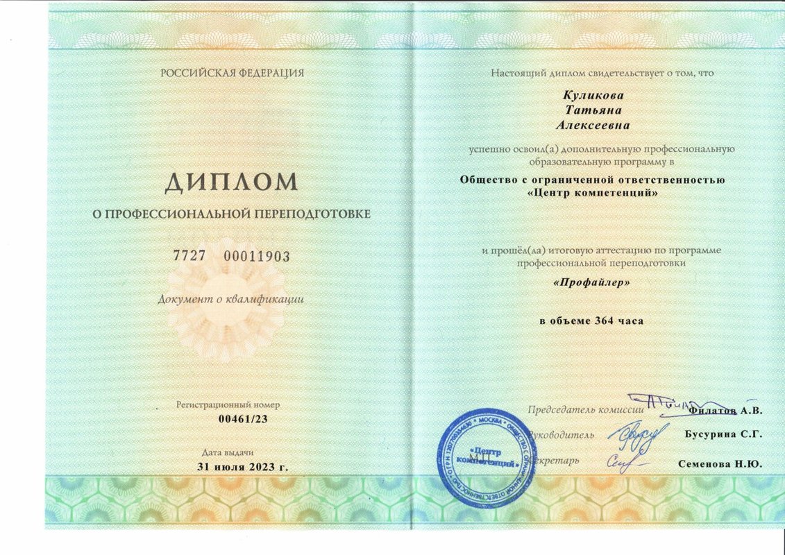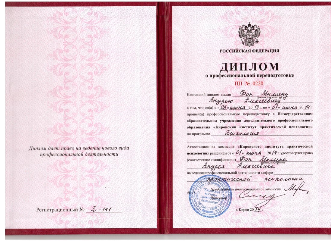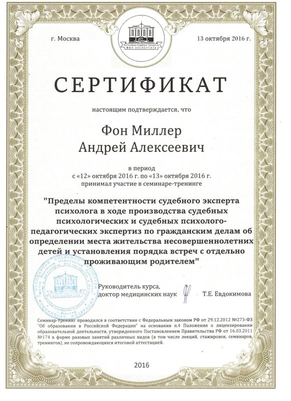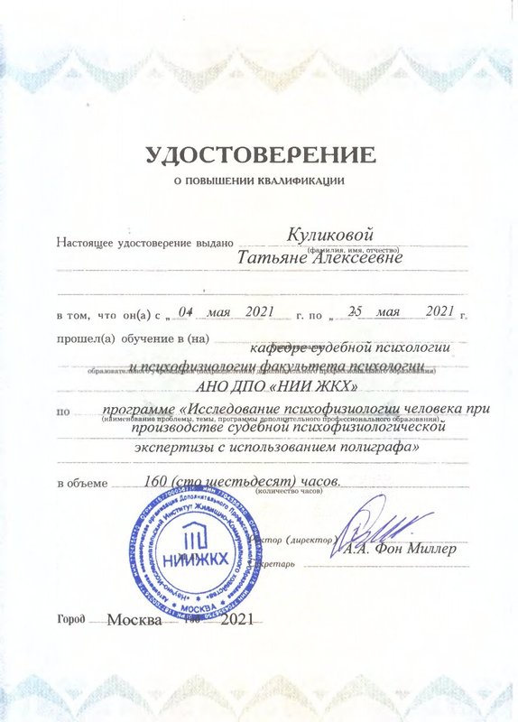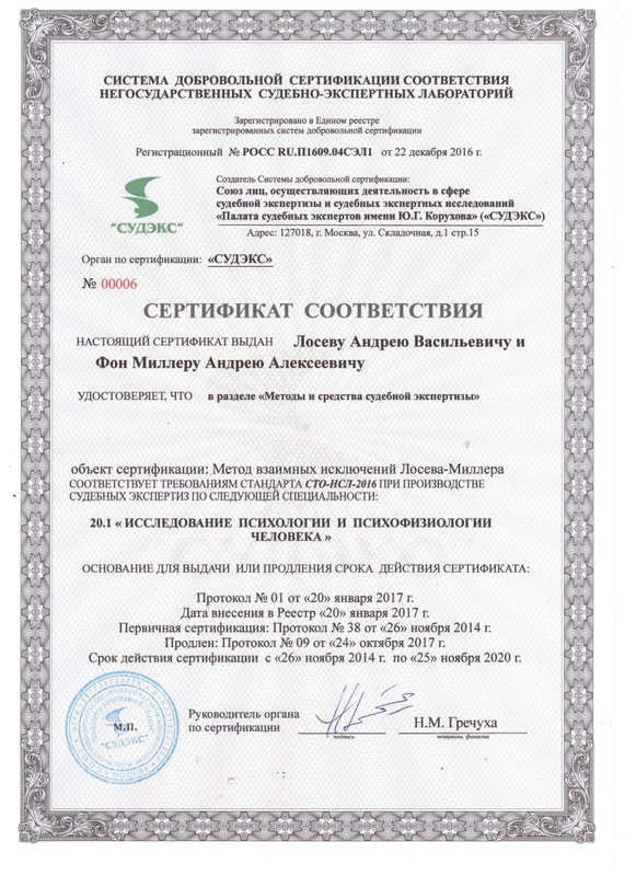 а также огромное количество повышений квалификаций и курсов, в том числе лицензия на использование Метода взаимных исключений Лосева – Миллера при производстве психофизиологических исследований и опросов с использованием полиграфа.